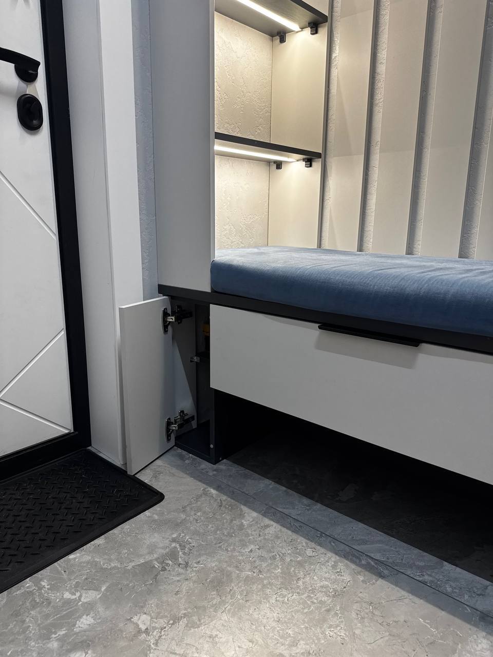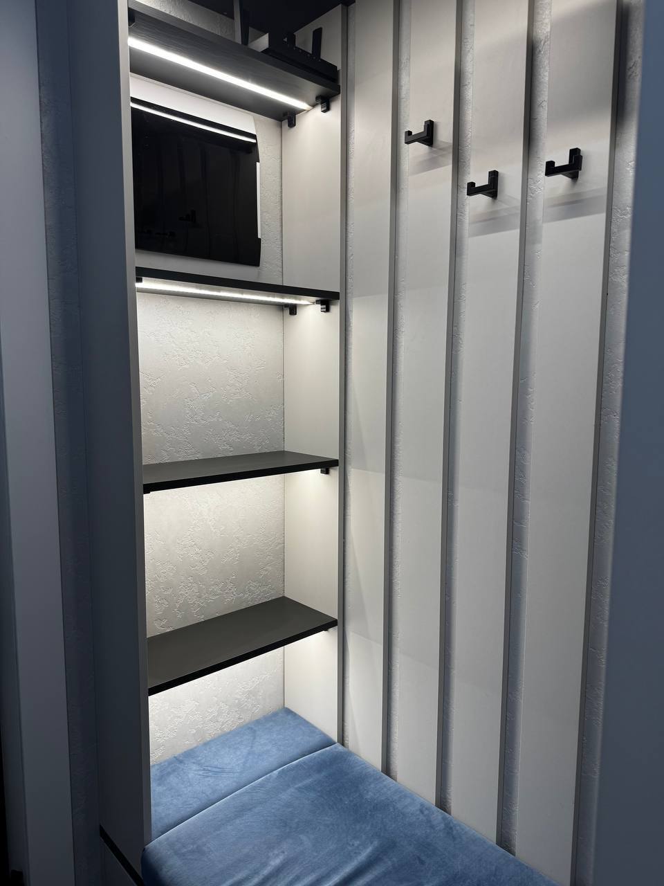- Световой акцент: Открытые полочки с подсветкой — не просто для красоты. Это навигация: ключи, мелочь, аромат для дома. Все на своих местах.