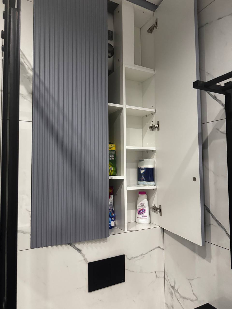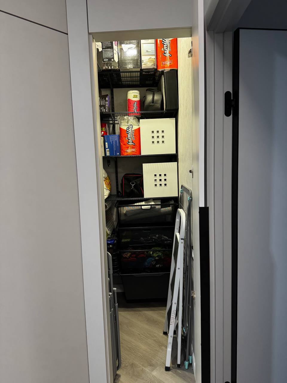 - Тайная комната: В углу шкафа мы организовали небольшую кладовую с удобными системами хранения для сезонных вещей, чемоданов или запасов. Больше ничего не валяется на антресолях!