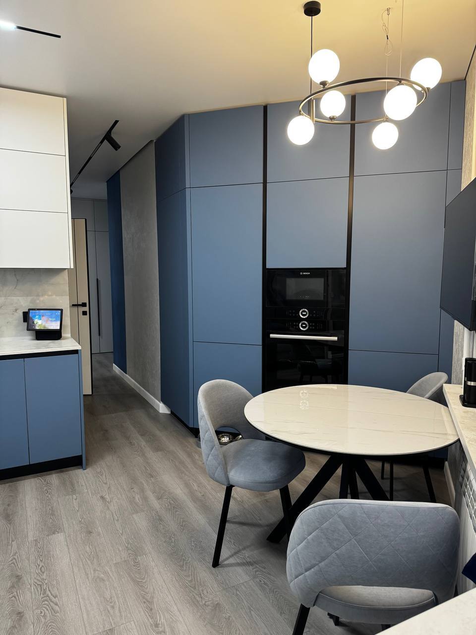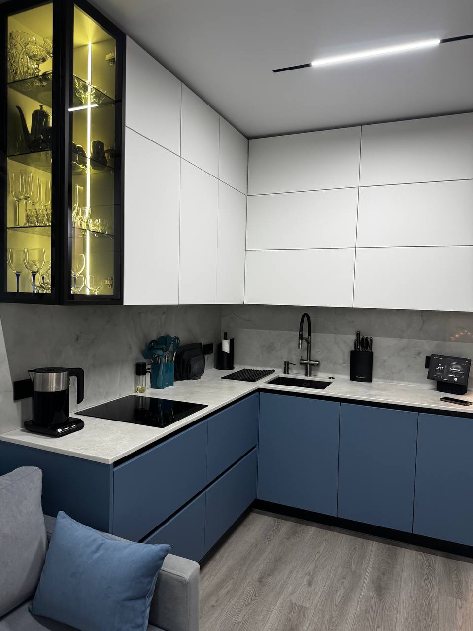 ✔️ Удовольствие — от тактильных доводчиков, сияния стеклянного шкафа и глубины синего цвета.