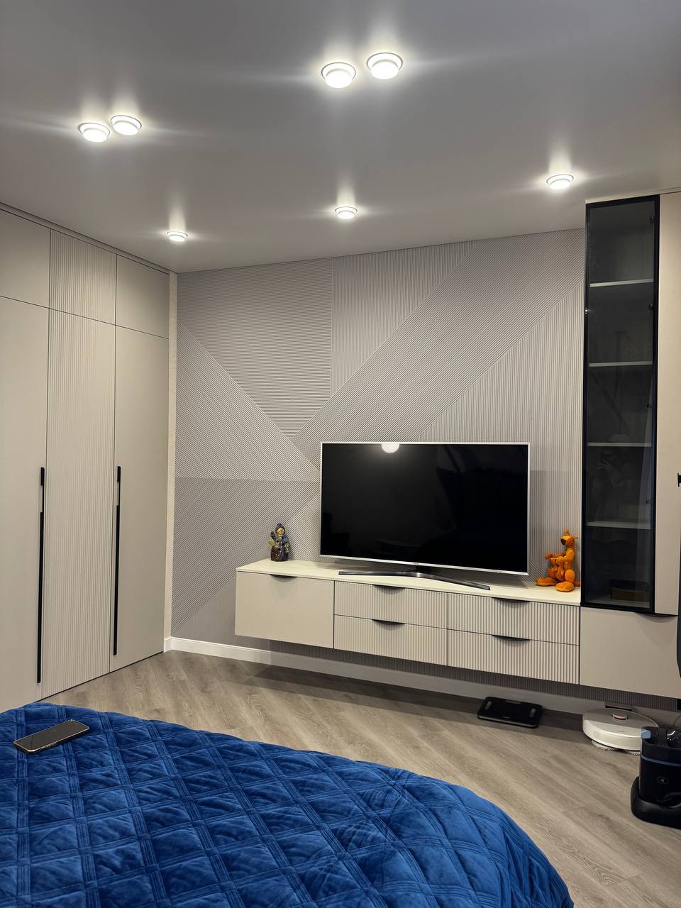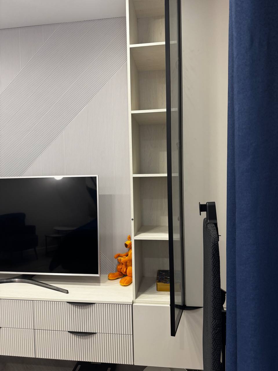 - Минималистичный медиацентр: Консоль под ТВ с выдвижными ящиками на тихих доводчиках и стеллажом — элегантное решение для техники и мелочей. Рядом — высокий пенал, разделенный на две зоны: закрытую для скрытых вещей и стеклянную — для красоты. Идеальный баланс.