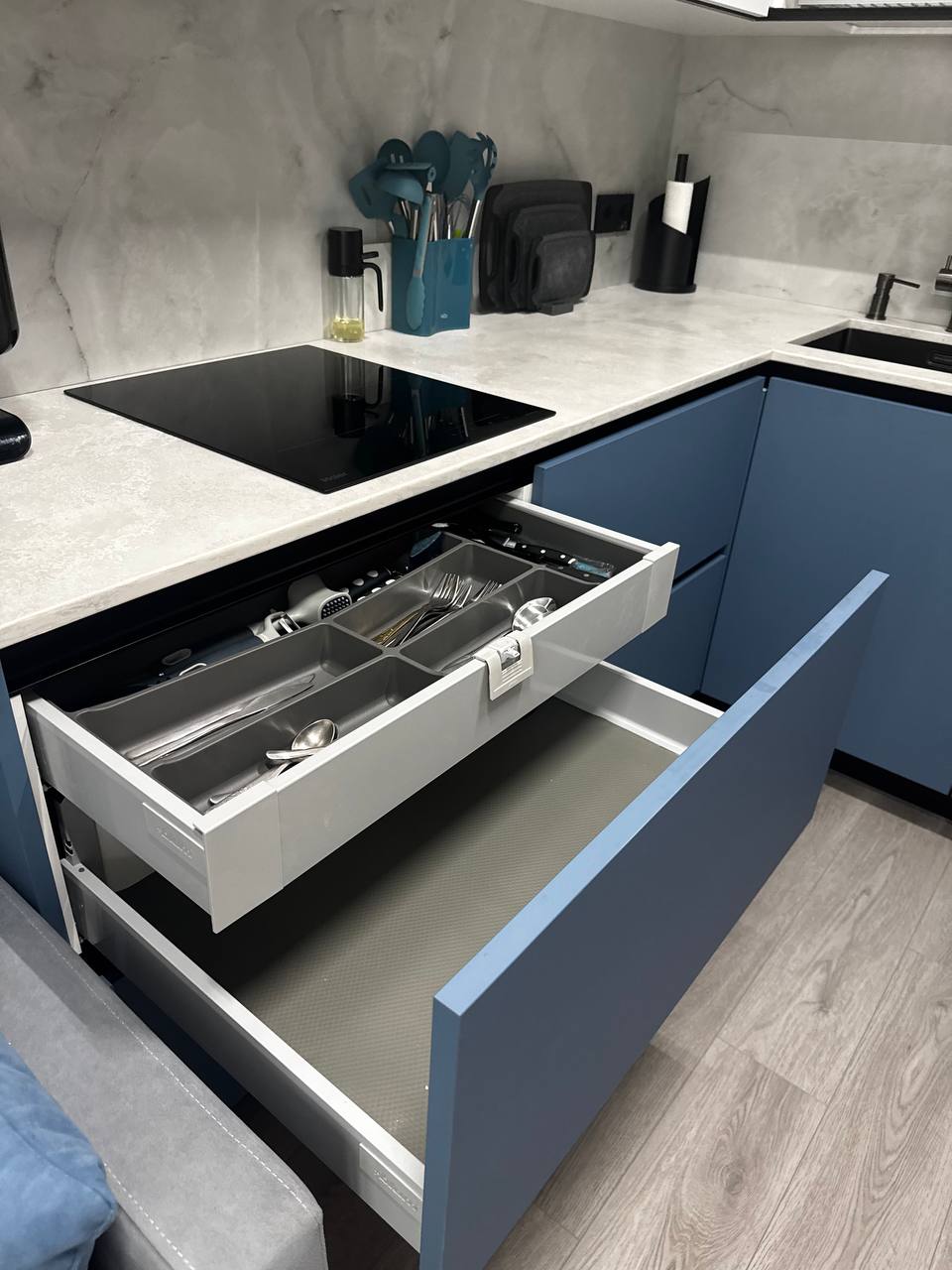 - Цветовая динамика: Глубокий насыщенный синий в нижних ящиках — это не просто смело. Это психология уюта, «якорь», который делает пространство стильным и теплым.