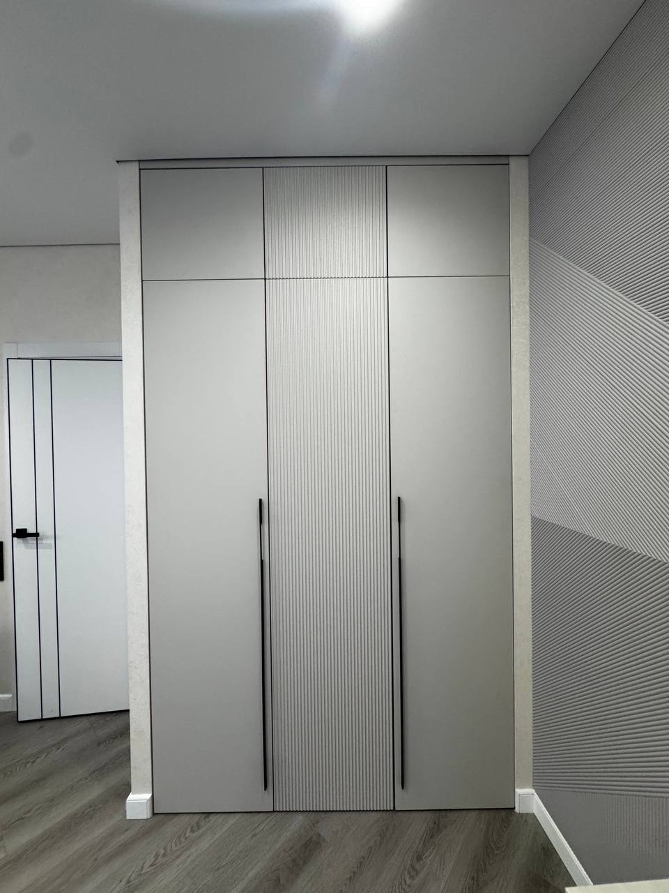 - Шкаф: Трехстворчатый шкаф с антресолью в светло-сером цвете — вместителен, но не громоздок. Фасады украшает актуальная фрезеровка — тренд 2025 года, добавляющая текстуры и изысканности. Внутри — целый мир: штанги разной высоты, полки, ящики и подсветка.