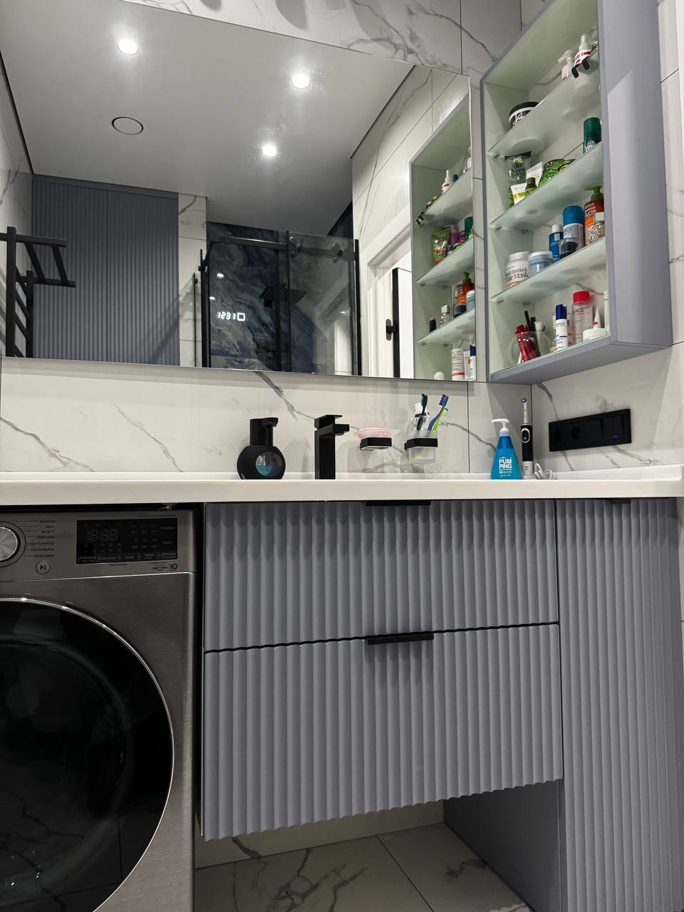 - Тумба под раковину в том же насыщенном синем тоне — не просто красива. Внутри — удобные выдвижные ящики с доводчиками. Рядом — открытая полка для ежедневной косметики.